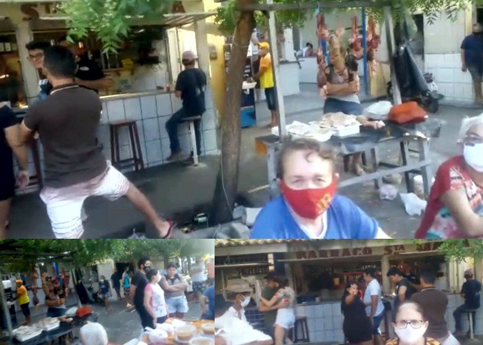 Pessoas são vistas sem estar usando máscaras, lixo e mercadorias expostas no chão, comércio de carne exposto a céu aberto sem a devida proteção, além de aglomeração de pessoas sem o respeito as normas de distanciamento social.