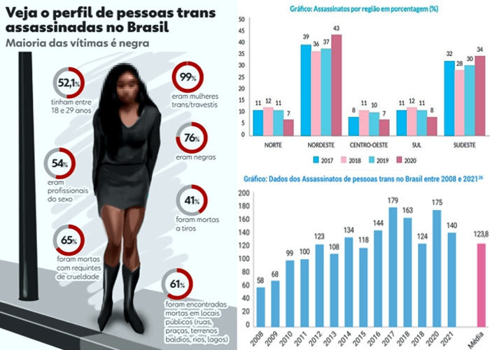 O Brasil teve 131 pessoas trans assassinadas em 2022, uma média de 11 por mês, segundo relatório anual da Associação Nacional de Travestis e Transexuais (Antra). As vítimas foram 130 mulheres trans/travestis e 1 homem trans.