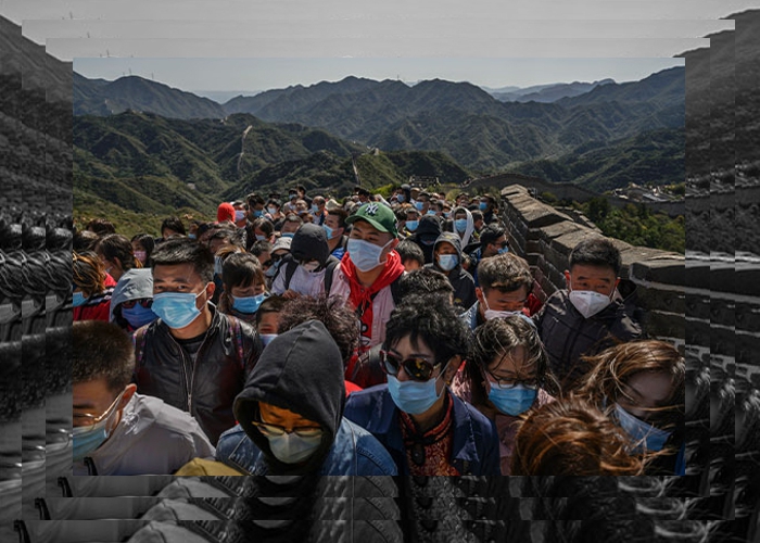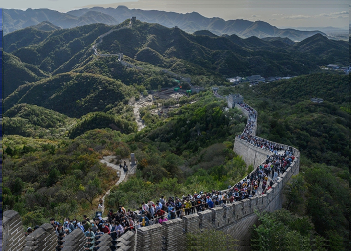 Multidão de turistas em Badaling, um dos locais mais visitados da muralha em Pequim, onde autoridades e celebridades normalmente param para conhecer a muralha.