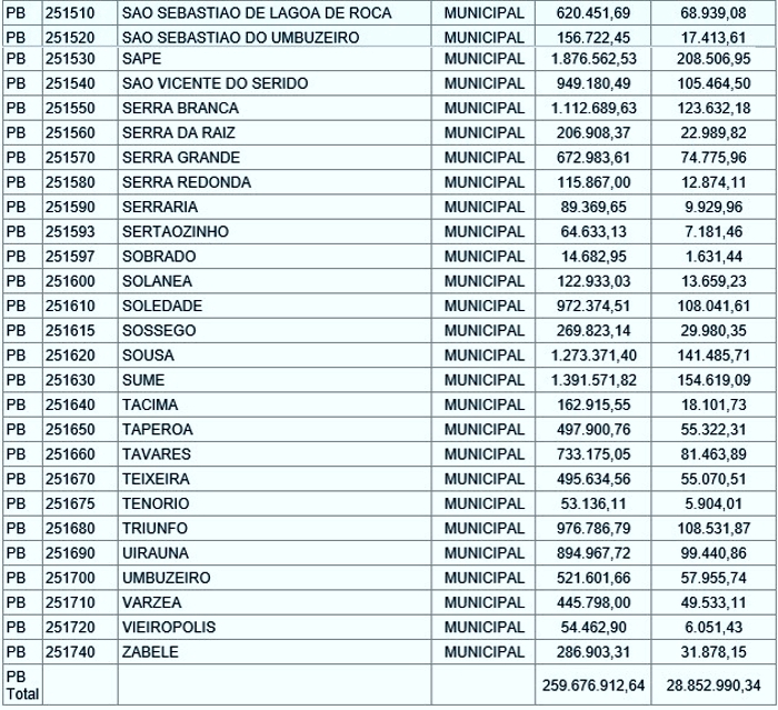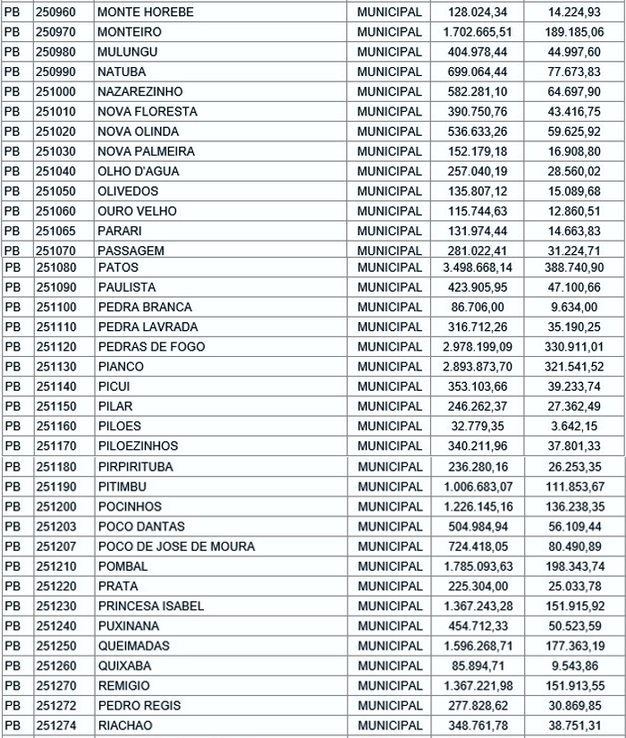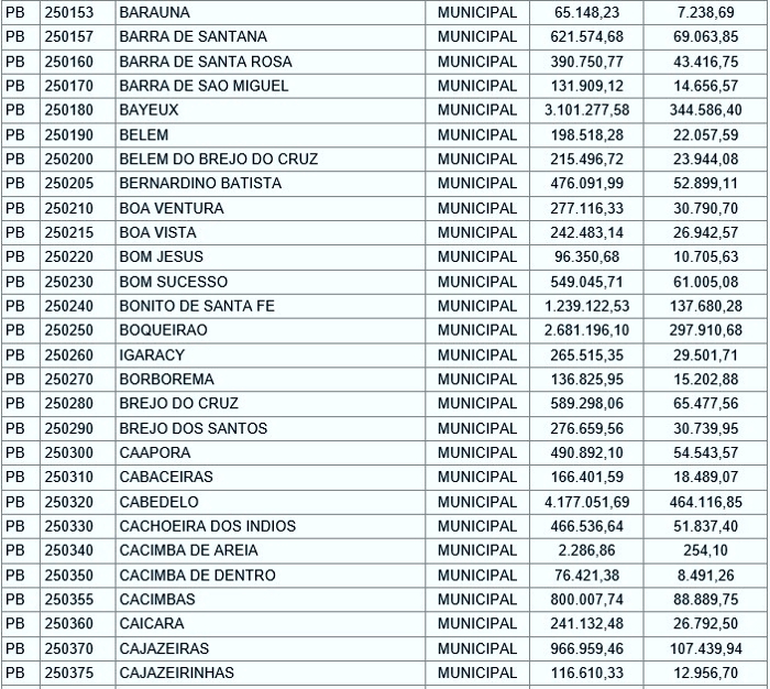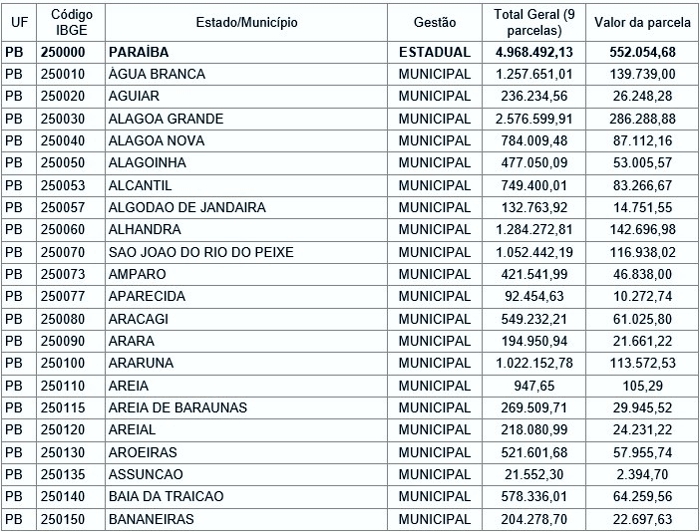 João Pessoa é a cidade que mais receberá recursos. Serão R$ 80,3 milhões. Já Campina Grande ficará com R$ 42,2 milhões. Enquanto isso, Salgado de São Félix receberá R$ 29 mil e Sobrado, R$ 14,6 mil.