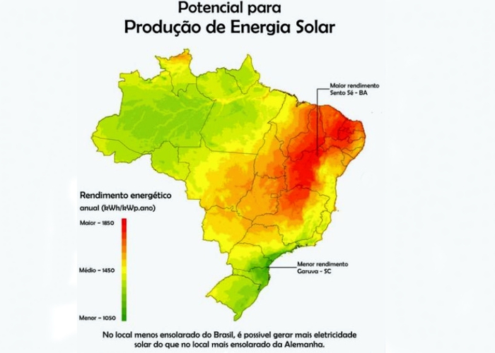 A região nordeste apresenta o maior potencial solar. Os valores mais baixos da região Norte se justificam pelas características climáticas desta região, onde a nebulosidade frequente reduz a irradiação solar.