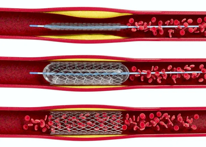 Durante o cateterismo, os médicos encontraram uma obstrução no coração e decidiram implantar um stent através de angioplastia.
