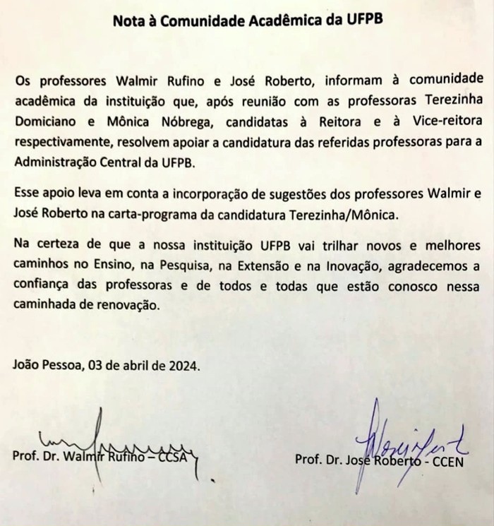 A decisão aconteceu no prazo final para registro de chapa para concorrer as eleições na Universidade Federal da Paraíba (UFPB), ao tem em que a dupla anunciou que irão apoiar a chapa encabeçada pelas professoras Terezinha Domiciano Dantas Martins e Mônica Nóbrega.