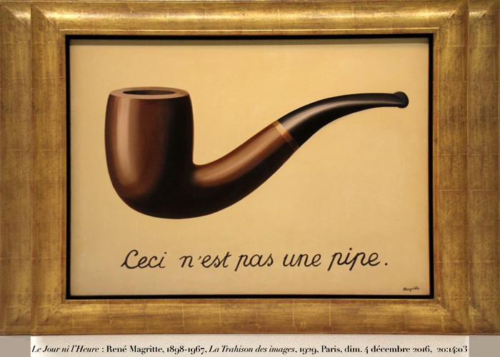 “A Traição das Imagens”, de René François Ghislain Magritte (Foto acima), de 1929, tem uma abordagem mais friamente cerebral. Combinando a imagem de um cachimbo com as palavras “Ceci N’est Pas Un Pipe” (“isto não é um cachimbo”, do francês), (Foto abaixo) obriga-nos a questionar o que vemos e o que nos dizem.