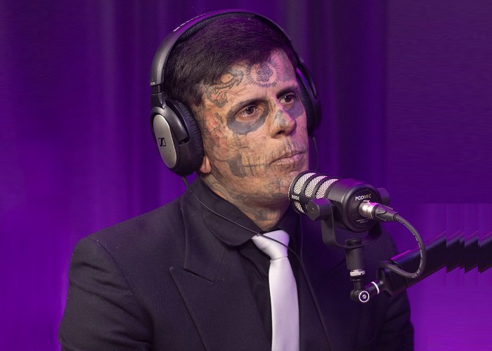 Um homem com o rosto tatuado de caveira está arrependido do desenho na pele, após se converter ao Evangelho e se batizar nas águas.