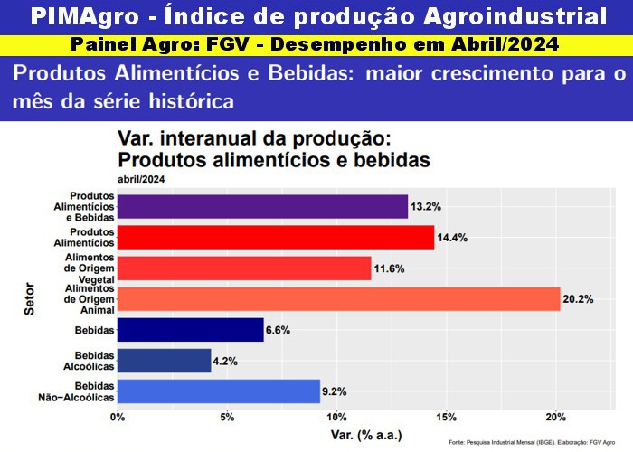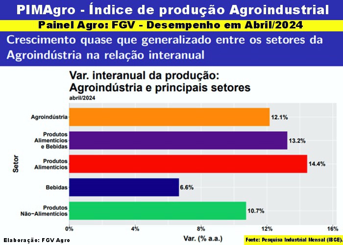 A pesquisa sobre agroindústria, do FGVAgro, revela que em abril, a produção agroindustrial registrou uma expansão de 12,1% frente ao mesmo mês de 2023.