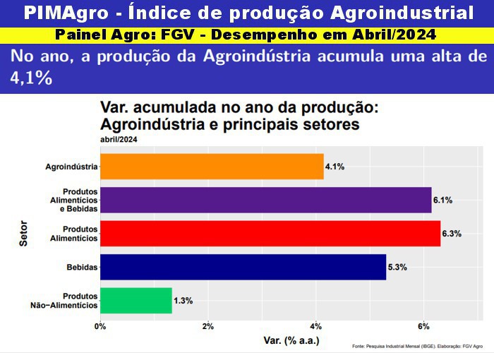 A alta da Agroindústria, nesse início de 2024, vem sendo derivada tanto do segmento de Produtos Não-Alimentícios (1,3%) como, principalmente, do de Produtos Alimentícios e Bebidas (6,1%).