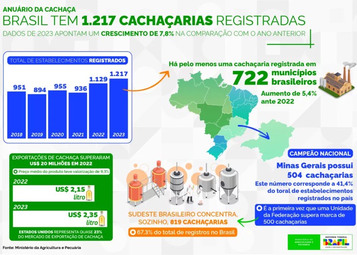 Segundo os dados, em 2023 o número de cachaçarias registradas foi de 1.217, sendo um crescimento de 7,8% com base no ano anterior.